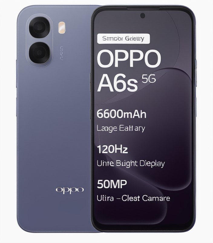 OPPO A6s 5G mobile was launched on 18th March 2026. The phone comes with a 120 Hz refresh rate 6.75-inch touchscreen display offering a resolution of 720x1570 pixels at a pixel density of 256 pixels per inch (ppi). OPPO A6s 5G is powered by an octa-core MediaTek Dimensity 9300 processor. It comes with 4GB of RAM. The OPPO A6s 5G runs Android 15 and is powered by a 6500mAh non-removable battery. The OPPO A6s 5G supports 80W Fast Charging fast charging.